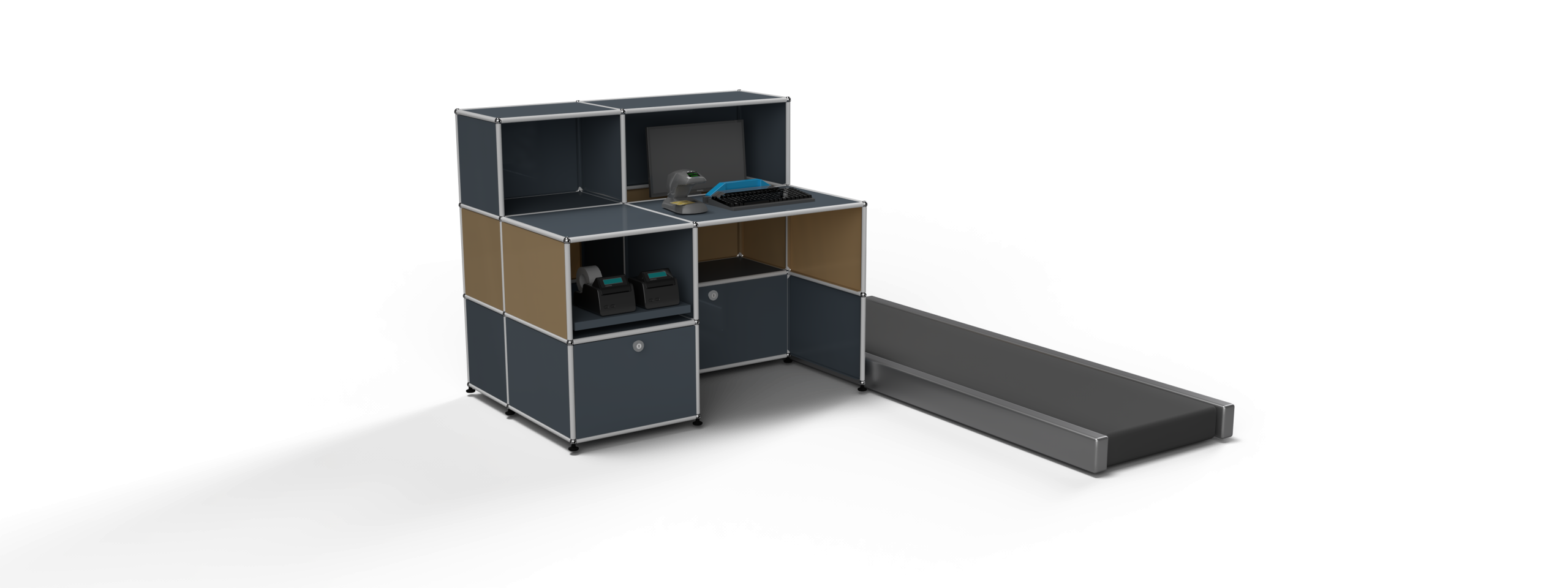 This basic module features a sunken monitor shelf, an extension shelf for printers, and two drop-down doors to house a CPU and general storage.